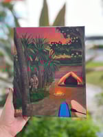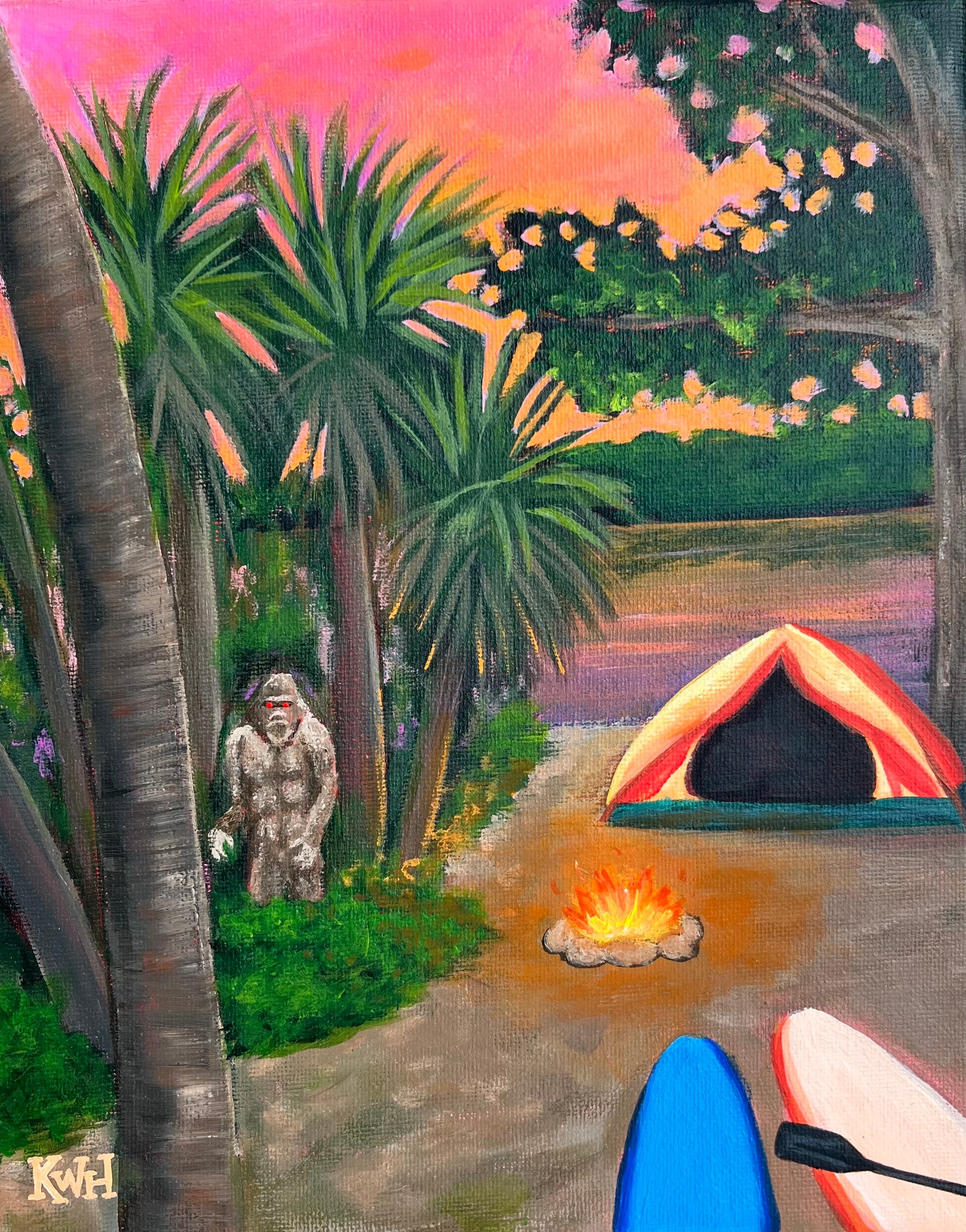 This painting features the Skunk Ape peaking out of the brush at a campsite in Fort DeSoto Park in St. Pete, FL. The raccoons aren’t the only thing lurking in the trees at the Fort DeSoto campgrounds.