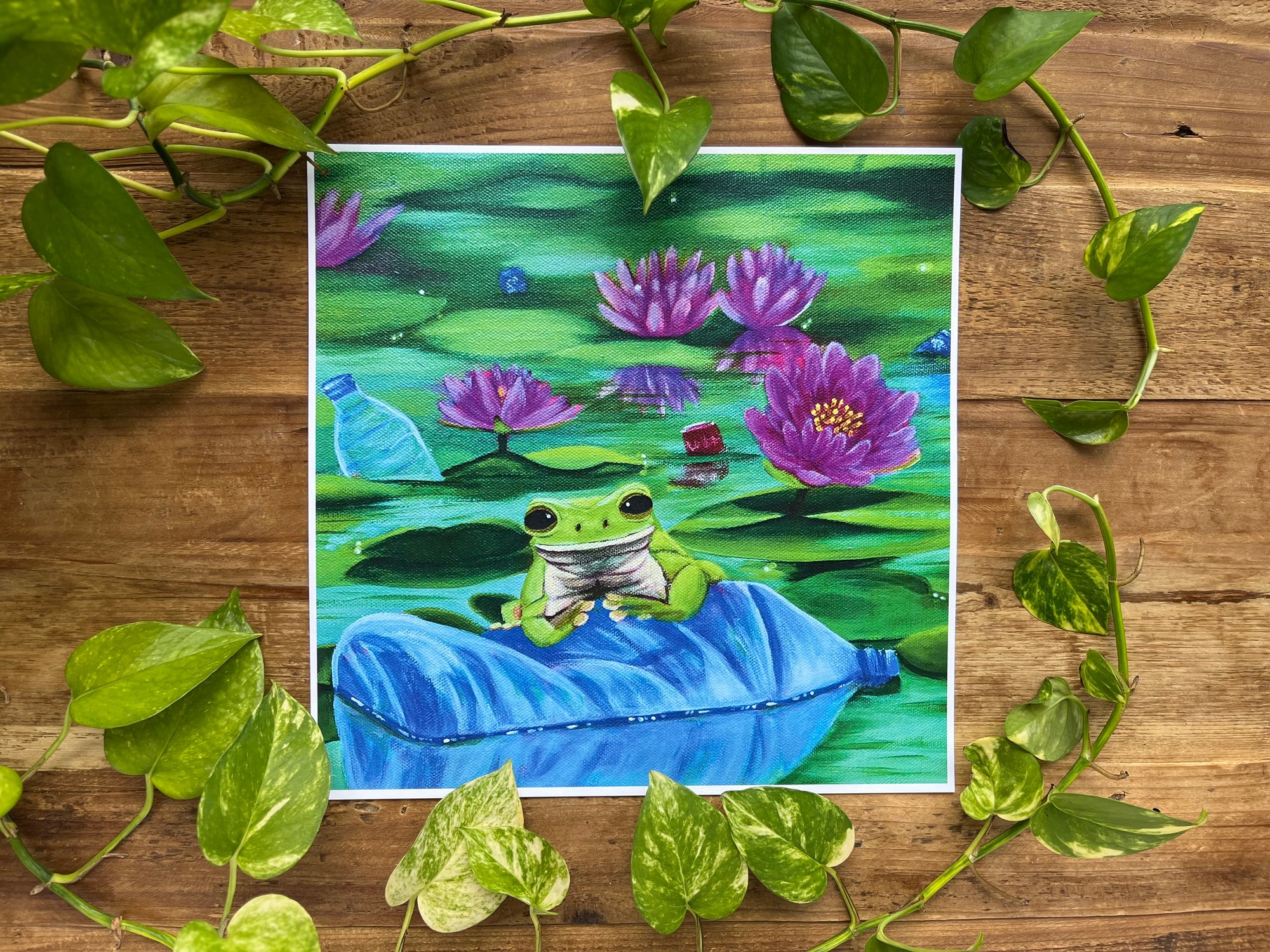 This print shows a small frog floating atop a discarded water bottle among the lily pads and trash.