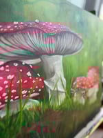 Original painting of Amanita muscaria. These red-capped mushroom toadstools are growing on the forest floor among the leaf litter. Green fog can be seen in the background and small orbs float in the air, giving the setting a spooky, yet whimsical feel.