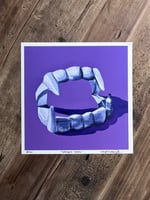 Print of nostalgic plastic vampire teeth on a purple background.
